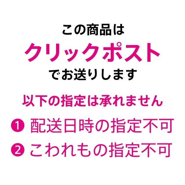 この商品はクリックポストでお送りする商品のため、「配送日指定」や「こわれもの」の指定ができません。また、記入いただいた住所の不備など、当店の瑕疵ではない事情により受け取りができずに当店へ差し戻された商品を再発送する際は実費の配送料を別途頂戴いたします。