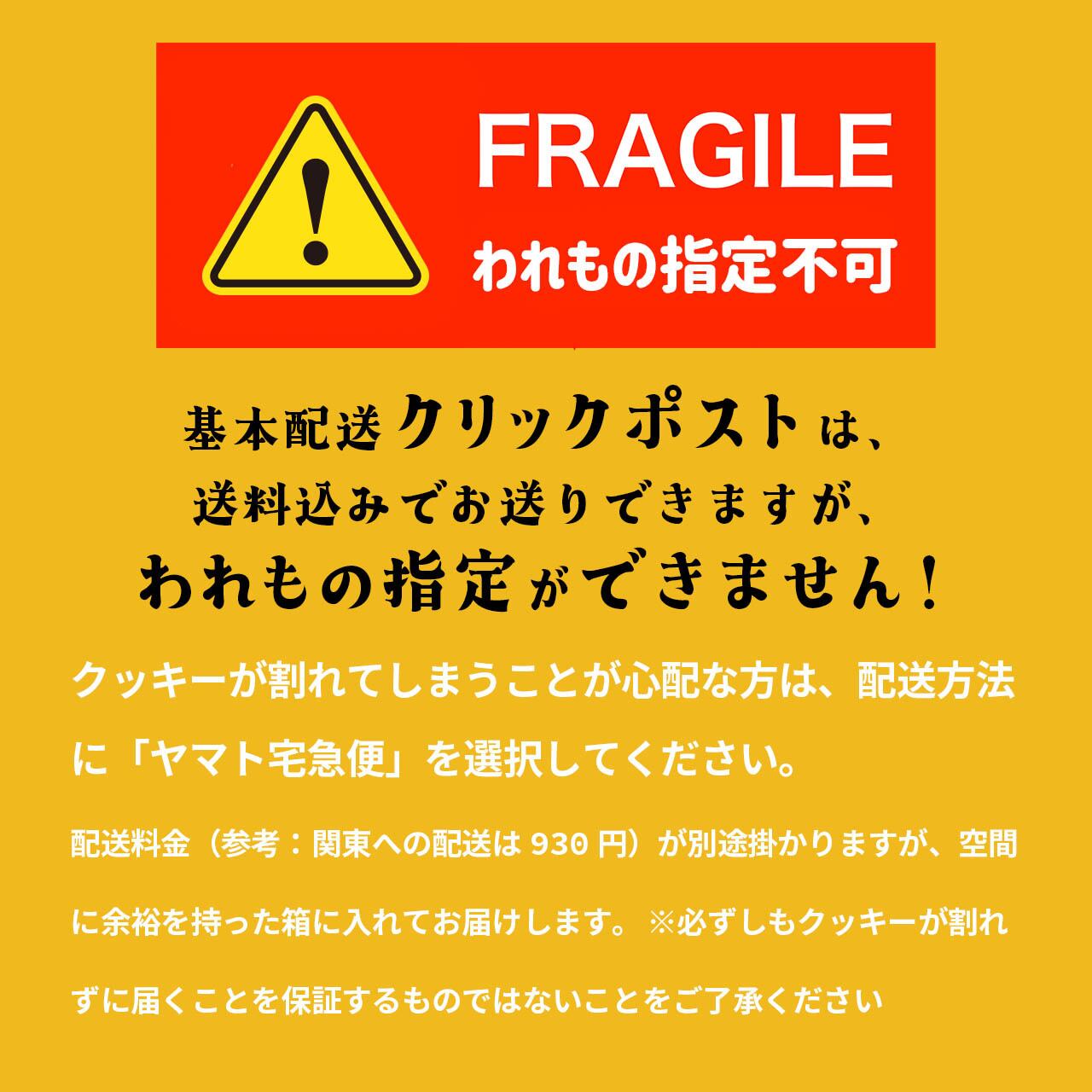 クッキーが割れてしまうことが心配な方は、配送方法に「宅急便」を選択してください。配送料金(参考:関東への配送は930円)が別途掛かりますが、空間に余裕を持った箱に入れてお届けします。