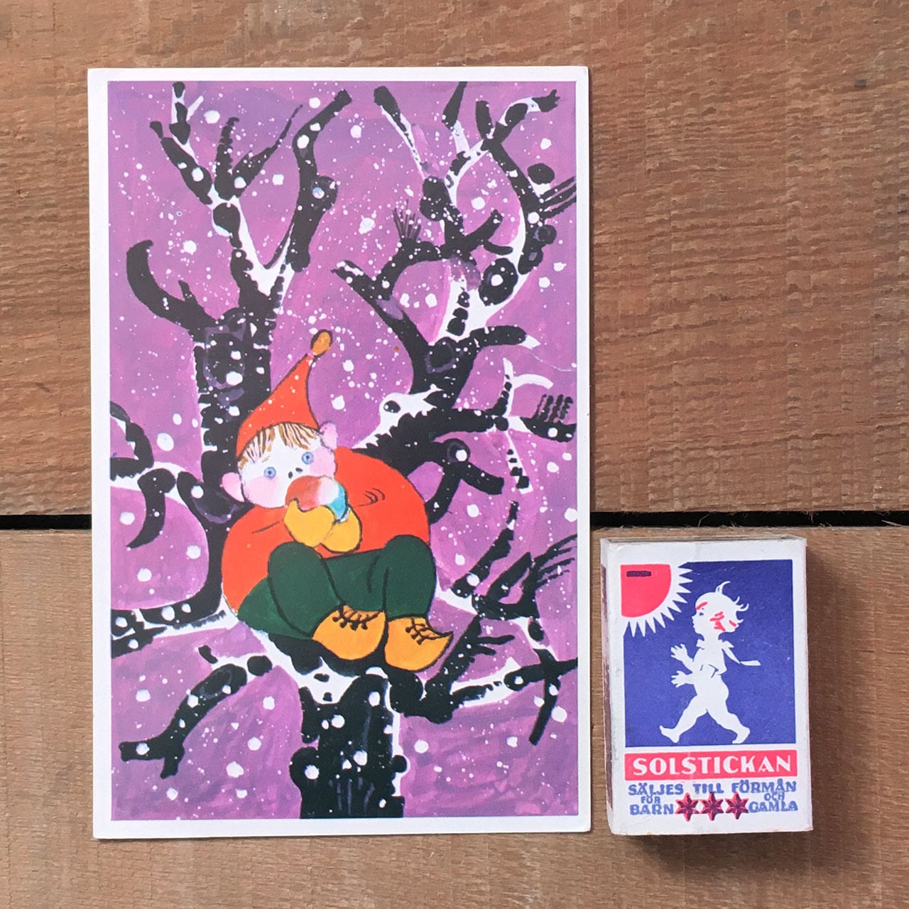 スウェーデンのレトロなクリスマスカード。裏面には「GOD JUL(メリークリスマス)」と「GOTT NYTT ÅR(ハッピーニューイヤー)」と印刷されています。